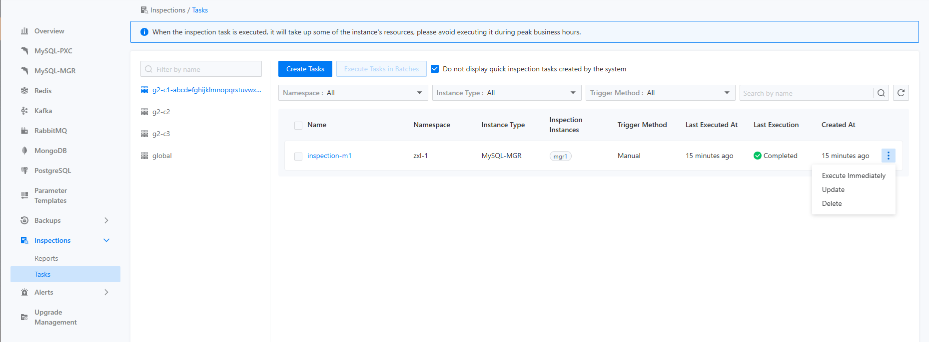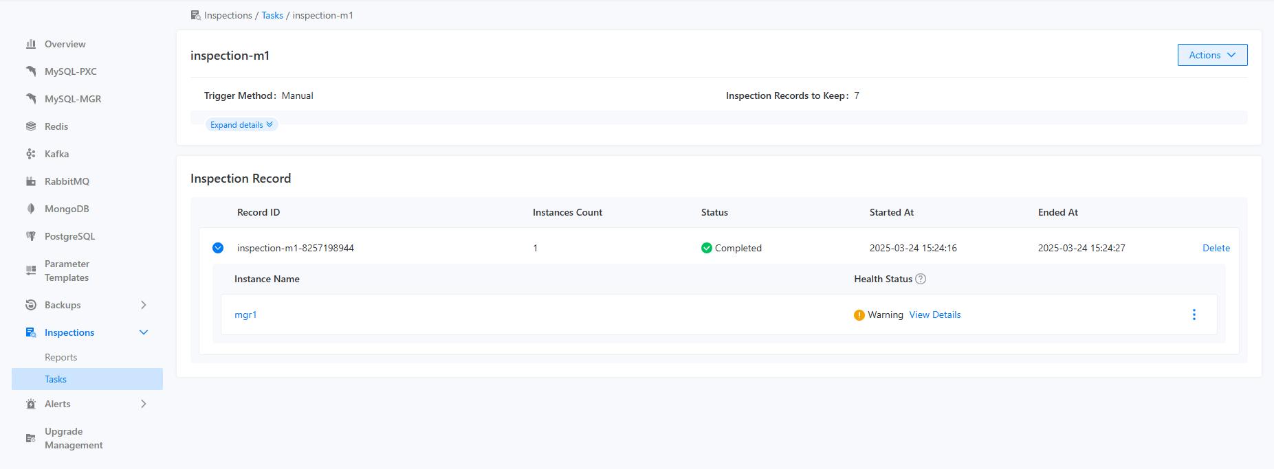There are two trigger methods for inspection tasks: manual trigger and scheduled trigger. If a user chooses to manually trigger an inspection, the corresponding inspection action will be executed immediately, and the inspection results will be presented in different locations depending on the trigger method.