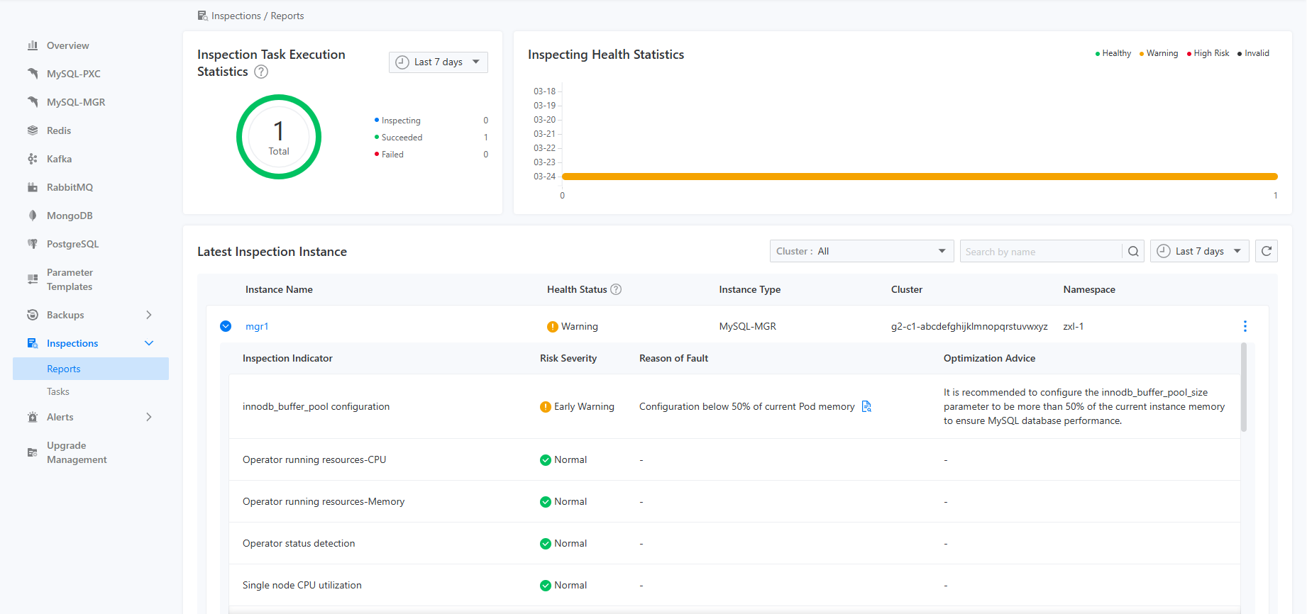 • If the user triggers the inspection from the details page of a specific component instance, the inspection results will be displayed on that component instance's details page, and will also appear on the inspection report page, as shown in the images below:
