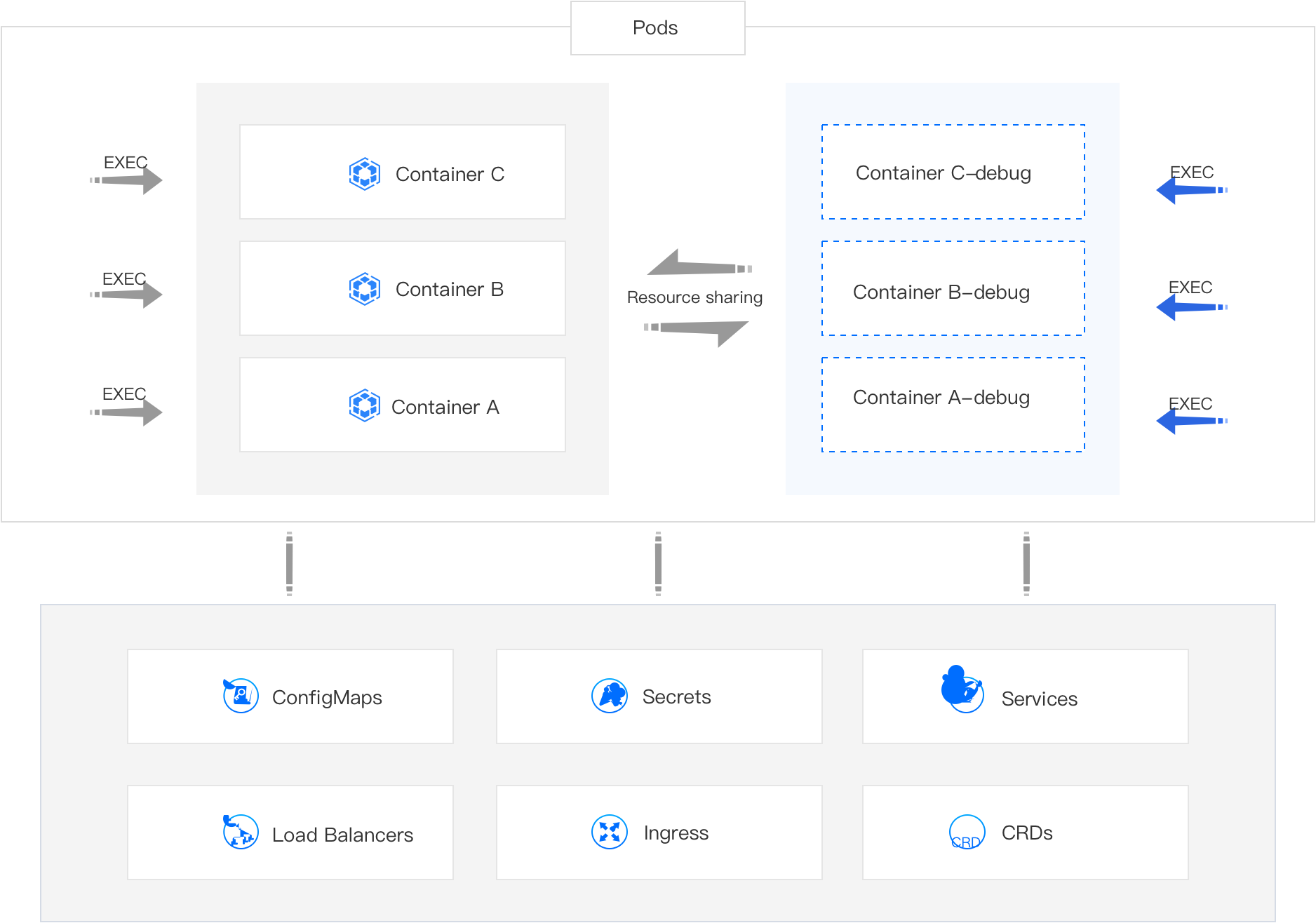 * **Ephemeral Containers** created via the debug feature do not have resource (CPU/Memory) or scheduling guarantees (i.e., they don't block Pod startup or get their own QoS class) and will not automatically restart if they exit. Therefore, avoid running persistent business applications within them; they are strictly for debugging purposes.