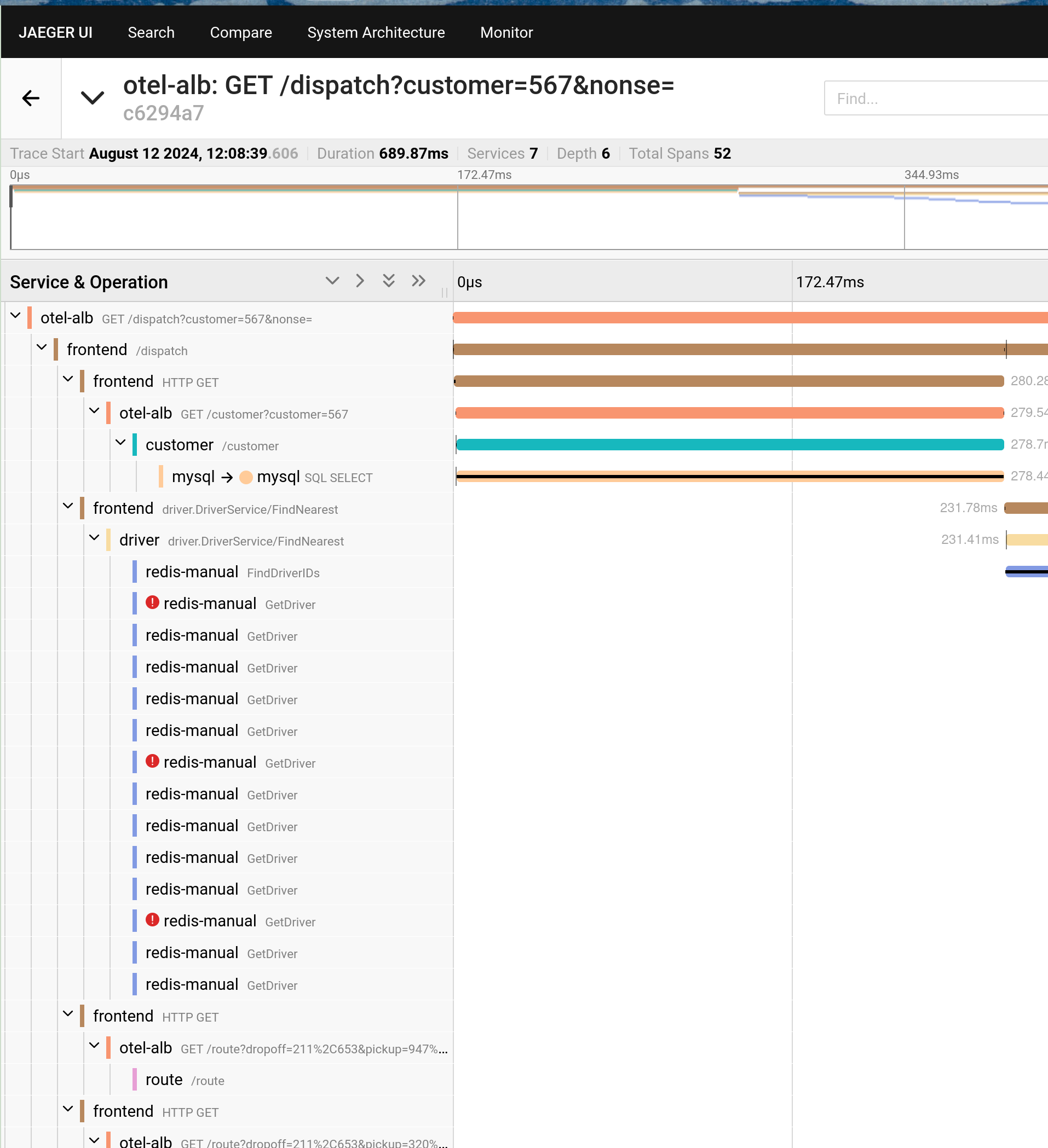 curl -v "http://<$ALB_IP>:80/dispatch?customer=567&nonse=" # Replace <$ALB_IP> in the command with the access address of otel-alb obtained in the previous procedure